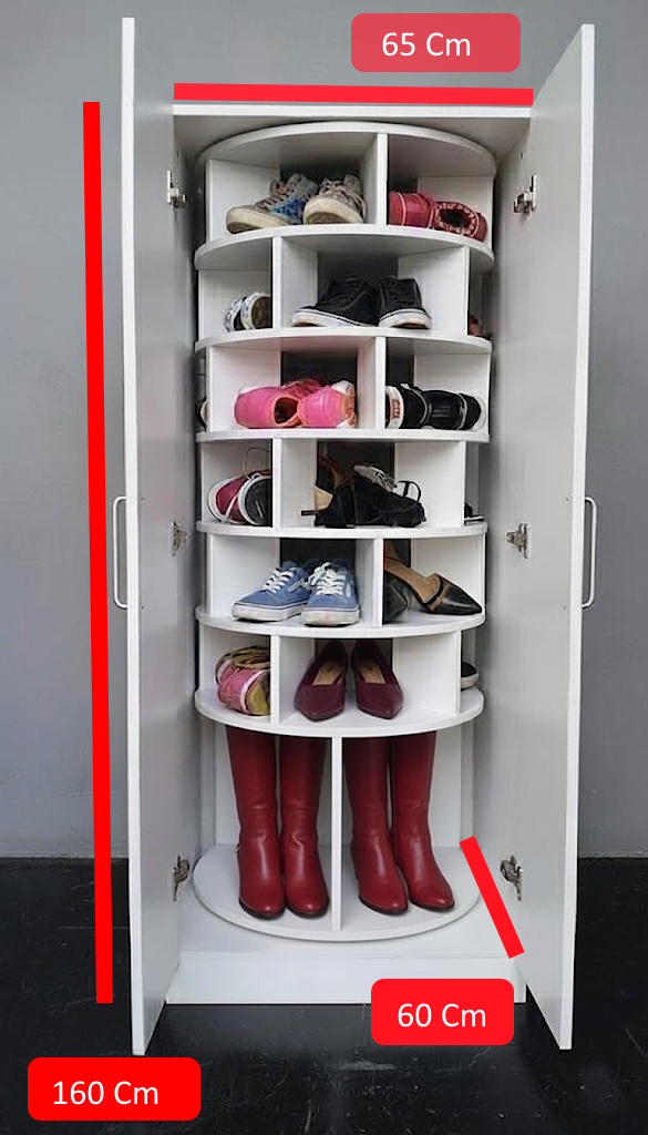 Maksimum Kapasite, Minimum Alan: Sadece 60x60 cm gibi kompakt bir taban alanı kaplamasına rağmen, akılcı dairesel bölmeleri sayesinde standart dolaplardan çok daha fazla ayakkabıyı düzenli bir şekilde saklar.