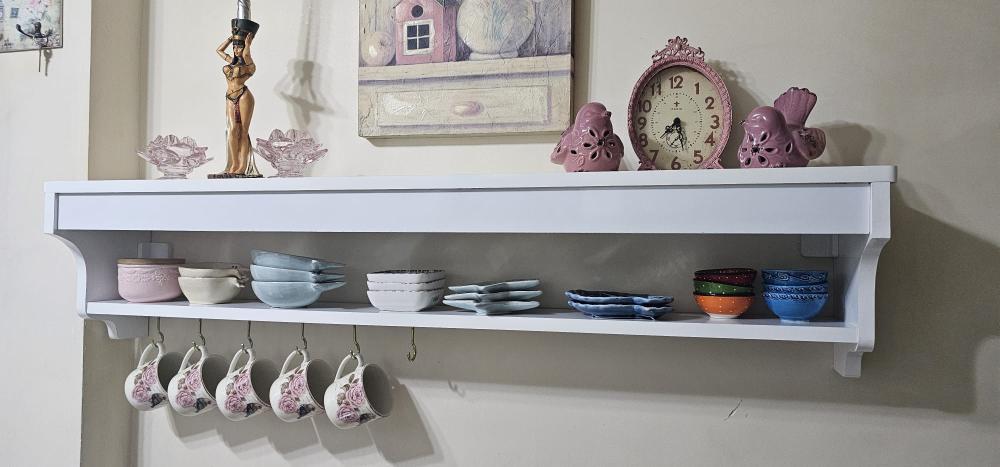 Çok Amaçlı Kullanım: Üst tabla üzerine dekoratif objelerinizi, baharatlıklarınızı veya saatlerinizi koyabilir; kancalara ise en sevdiğiniz kupaları asabilirsiniz.