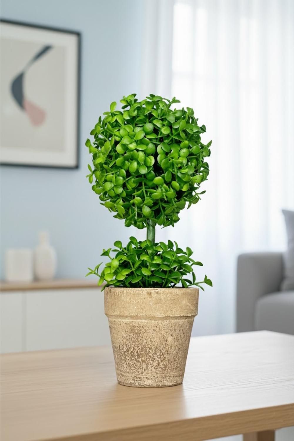 Doğal Görünümlü Dekoratif Eskitme Saksılı Yapay Top Şimşir Ağacı - Masaüstü Ofis ve Ev Dekoru