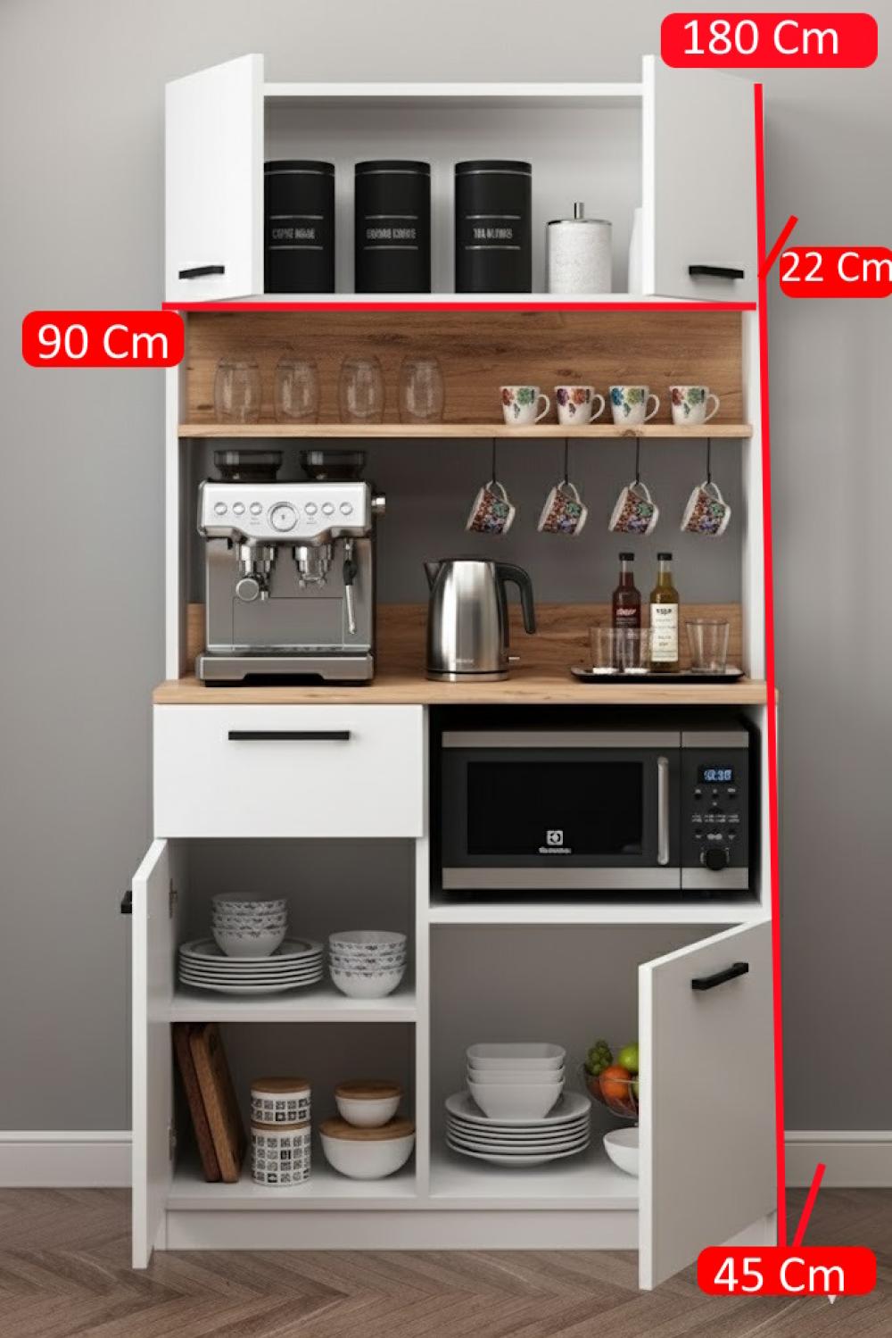 Üst Kapaklı Dolap: Günlük kullanmadığınız kahve/çay stoklarınızı, özel fincan setlerinizi veya baharatlarınızı saklamak için idealdir.