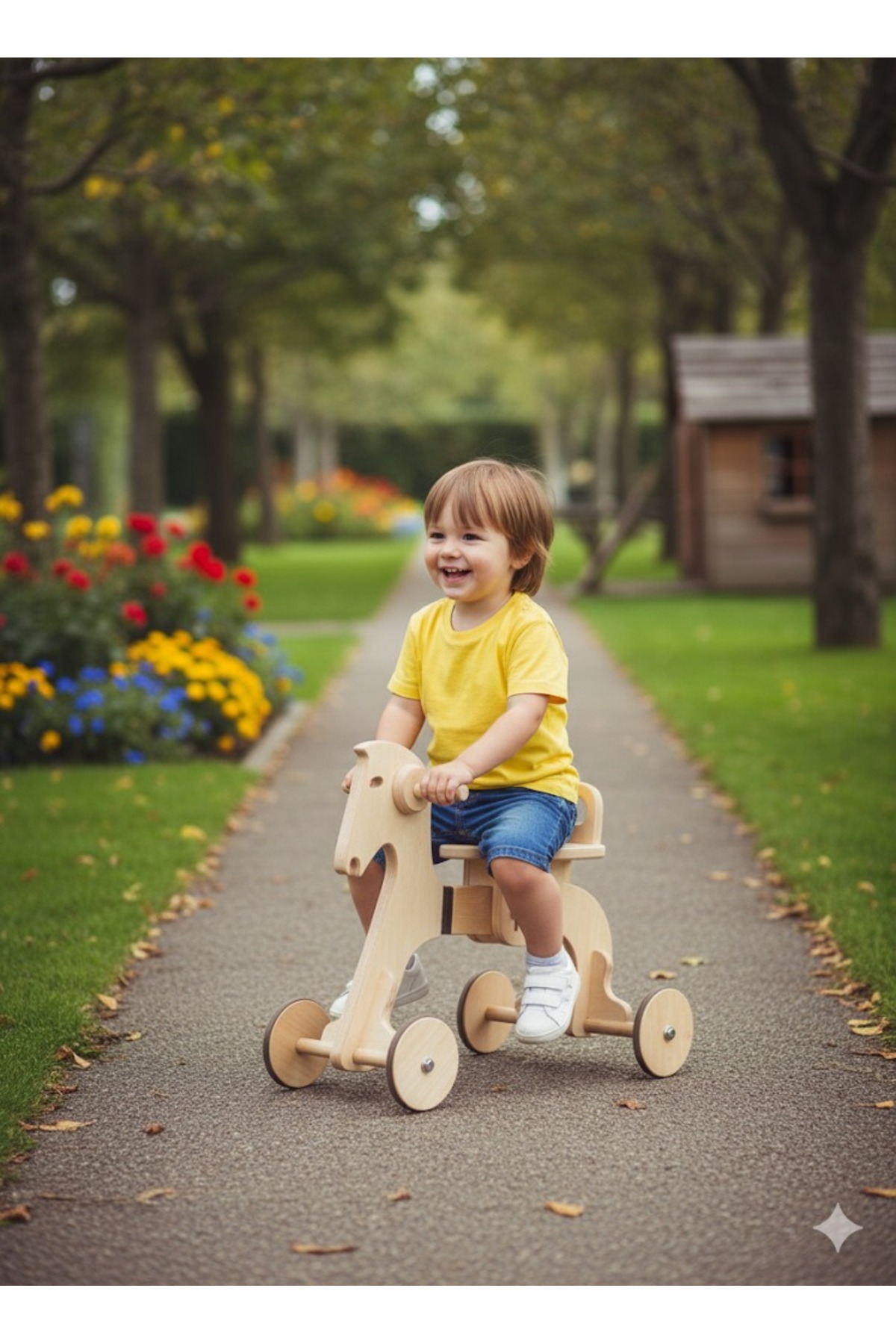 Çocuğunuza bisiklet sürmeyi öğretmenin en doğal ve sağlıklı yolu! Yan tekerlekli bisikletlerin aksine, Montessori felsefesine uygun olarak tasarlanan bu pedalsız bisiklet, çocuğun kendi vücut dengesini keşfetmesini sağlar. Çocuğunuz ayaklarıyla yerden güç alarak ilerlerken, hem bacak kaslarını güçlendirir hem de direksiyon hakimiyetini öğrenir. Üstelik sıradan bir bisiklet değil; ön kısmındaki "At Başı" tasarımıyla çocukların hayal dünyasında bir kovboyculuk oyununa dönüşür. 1. sınıf MDF'den üretilen gövdesi, plastik oyuncaklara göre çok daha sağlıklı, dayanıklı ve estetiktir.